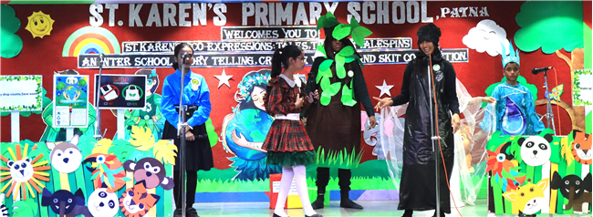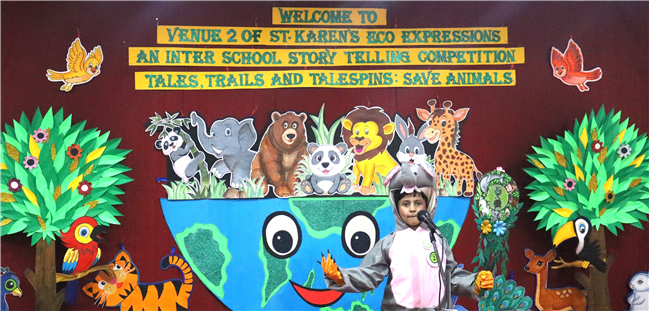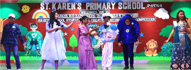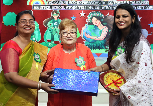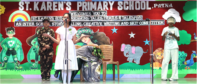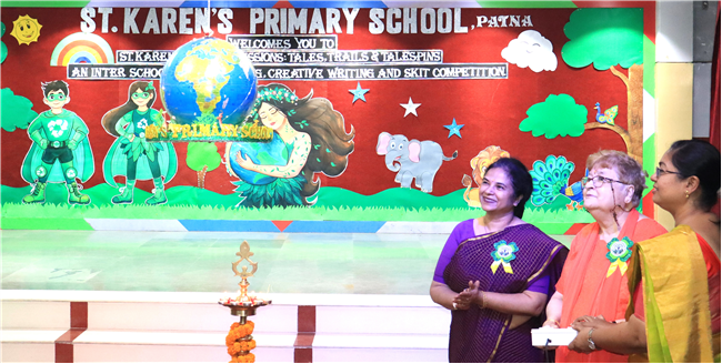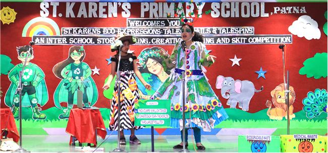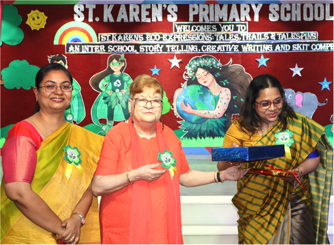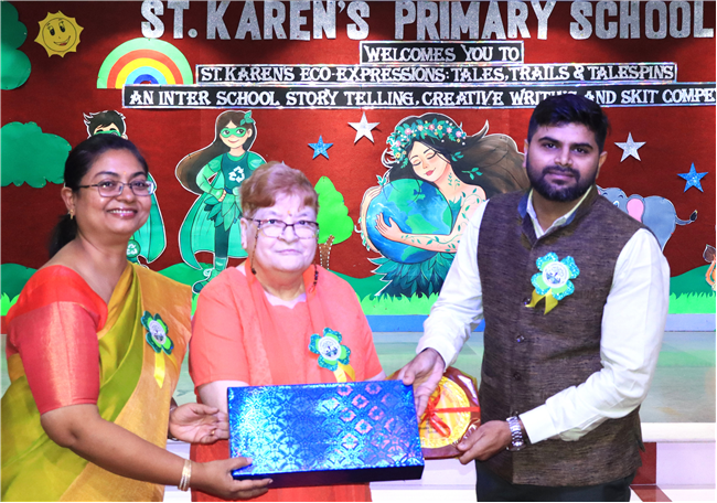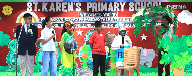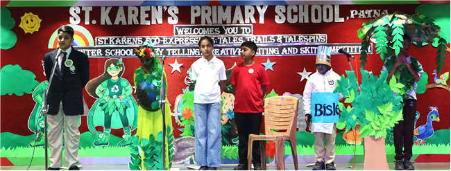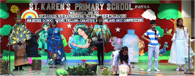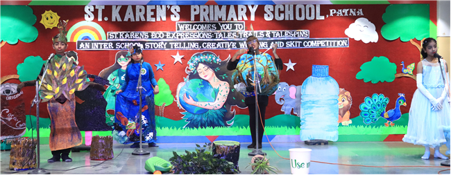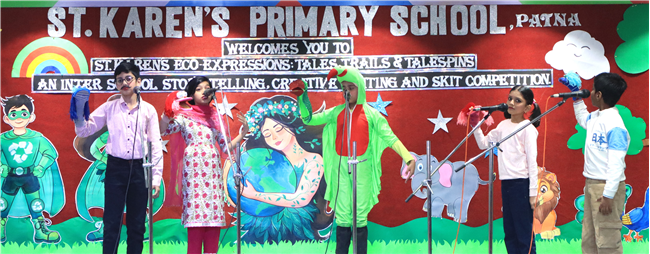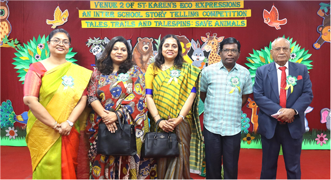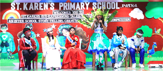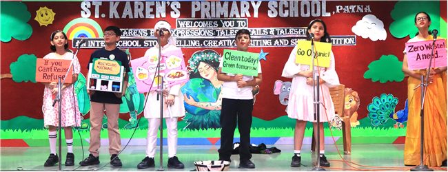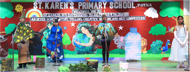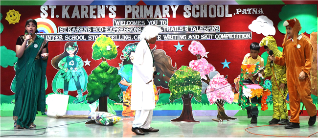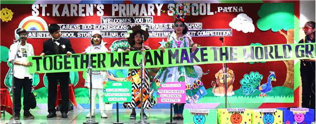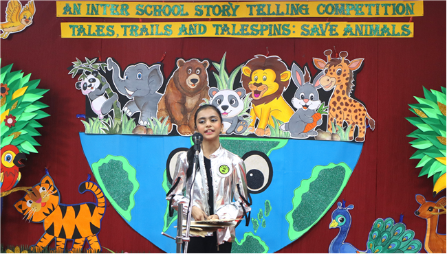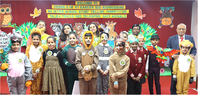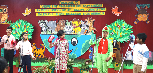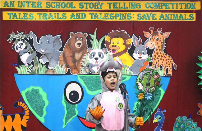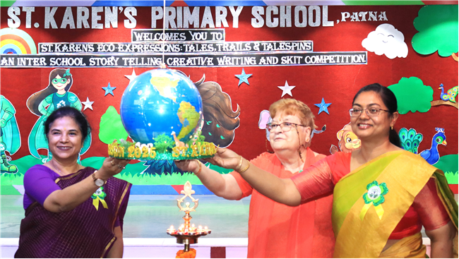 The programme began with the ceremonial lighting of the lamp by dignitaries and the Headmistress, setting an inspiring tone for the day. Participants from 12 reputed schools showcased their talents in Storytelling, Creative Writing and Skit Presentations, focusing on eco-friendly themes such as Save the Earth, Save Animals and Save the Environment.