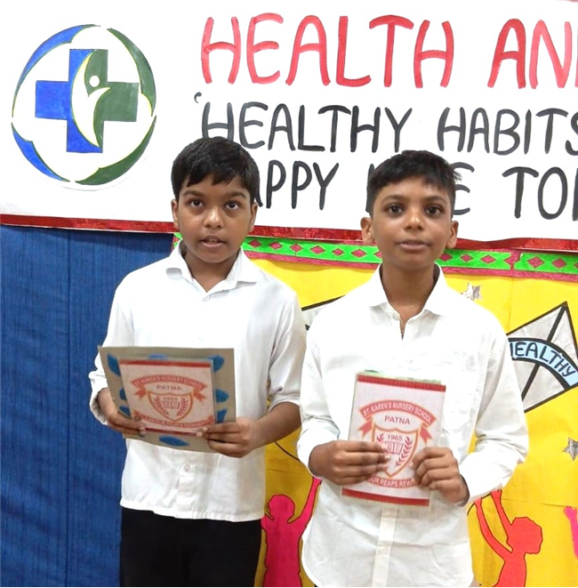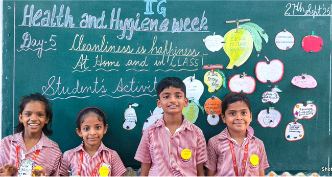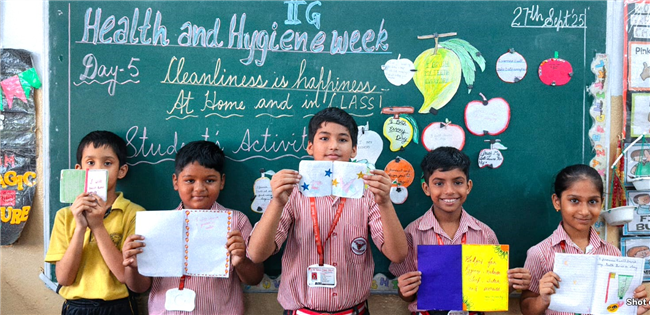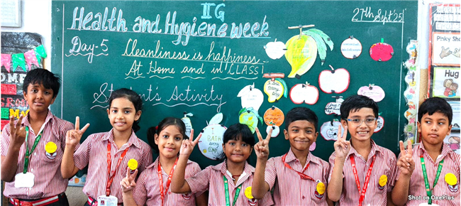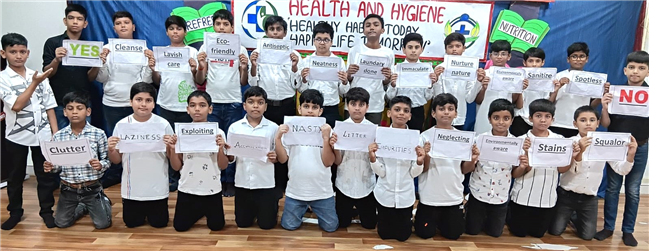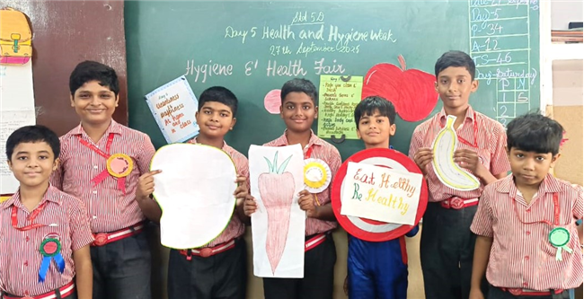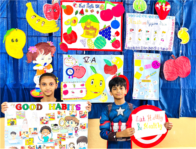 As part of the Hygiene & Health week, each house presented one healthy habit through creative fruit-shaped posters, highlighting brushing, handwashing, eating fruits, hydration and exercise. Children were awarded handmade “Healthy Star Certificates” and badges such as Healthy Hero and Hygiene Champ for their enthusiastic participation.